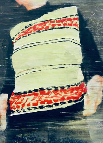 Am häufigsten arbeite ich mit Acrylfarben, die kurze Trocknungszeit erlaubt mir ein schnelles Arbeiten, was mir gefällt. Bei der Wahl der Materialien tendiere ich neben Leinwand, gelegentlich auch zu altem Stoff oder Holz, Untergründe, die bereits eine eigene Biographie haben.